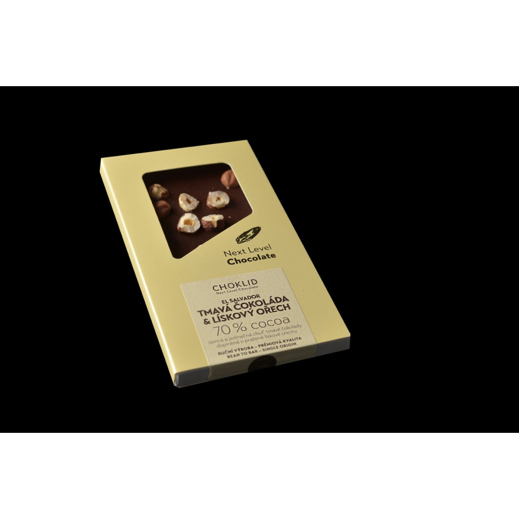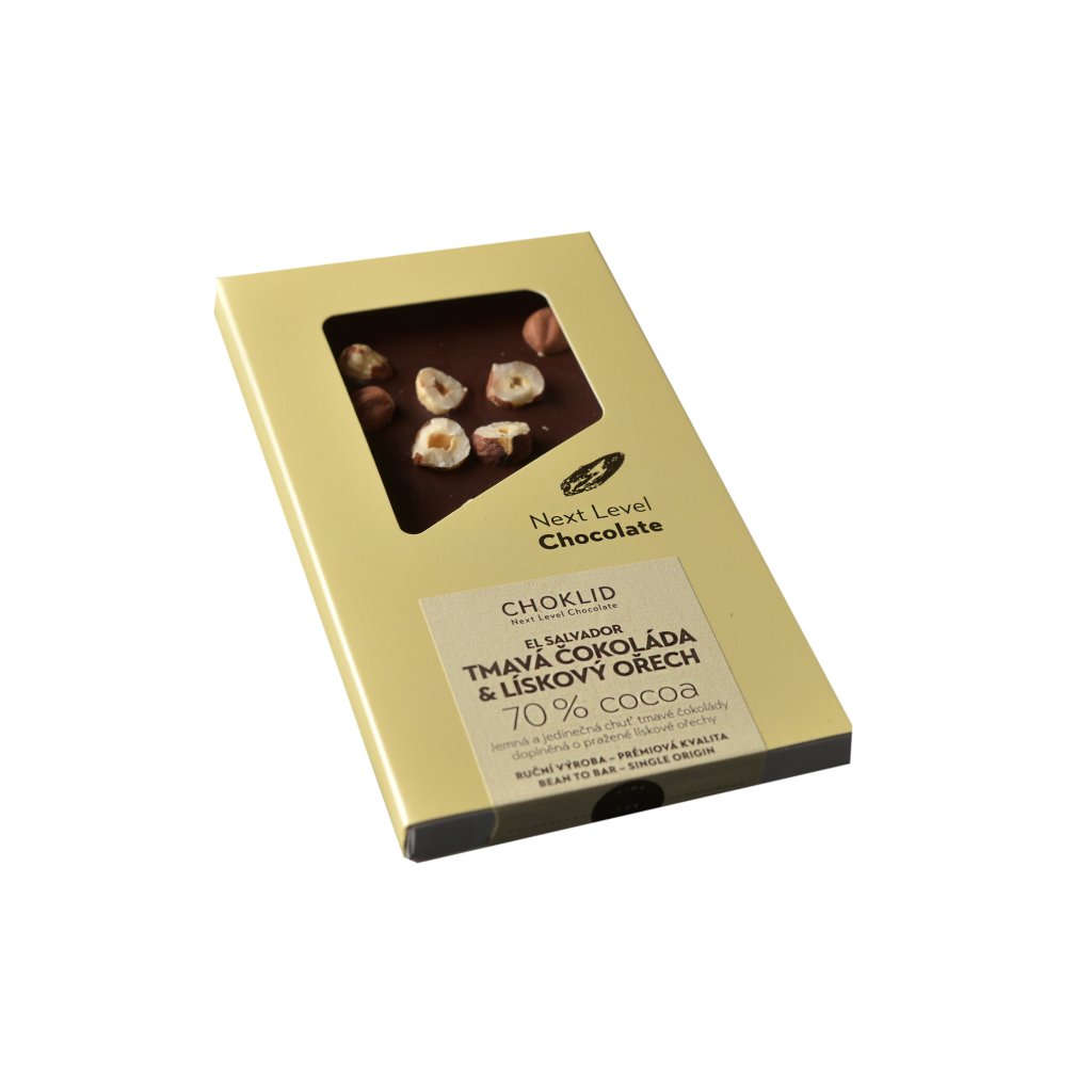 Tmavá čokoláda s lískovými ořechy. Minimální obsah kakaové sušiny 70%